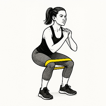 Mit einem Miniband um beide Oberschenkel können Kniebeugen intensiviert werden. Das Band fügt zusätzlichen Widerstand hinzu, wodurch die Oberschenkelmuskulatur stärker angesprochen wird. Stellen Sie sich hüftbreit hin und platzieren Sie das Miniband oberhalb der Knie. Den Bauch anspannen und den Rücken gerade halten. Gehen Sie langsam in die Hocke, indem die Hüfte nach hinten geschoben wird. Am tiefsten Punkt halten, um die Spannung im Miniband zu spüren, dann kraftvoll in die Ausgangsposition zurückschieben.