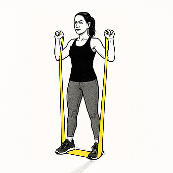 Stellen Sie einen Fuß auf das Fitnessband und halten Sie das Band mit den Händen. Ziehen Sie Ihre Hände nach oben in Richtung der Schultern und senken Sie sie im Anschluss kontrolliert wieder. Diese Übung ist ideal, um den Oberarm zu stärken.