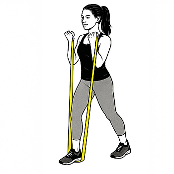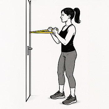 Befestigen Sie das Fitnessband auf Brusthöhe (zum Beispiel an einer Tür oder einem Baum) und halten Sie es mit leicht gebeugten Armen vor sich. Stehen Sie in hüftbreitem Stand und ziehen Sie das Band nach außen, bis sich die Schulterblätter zusammenziehen. Diese Übung stärkt die obere Rückenmuskulatur und fördert die Gesamtstabilität.