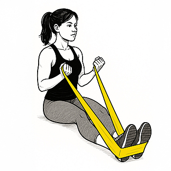 Setzen Sie sich mit gestreckten Beinen auf den Boden und legen Sie das Fitnessband um die Füße. Halten Sie das Band mit ausgestreckten Armen. Ziehen Sie nun das Band zum Oberkörper, indem Sie die Ellenbogen nach hinten führen. Halten Sie die Position kurz und kehren Sie kontrolliert in die Ausgangsposition zurück. Diese Übung aktiviert und trainiert die Rücken- und Schultermuskulatur.