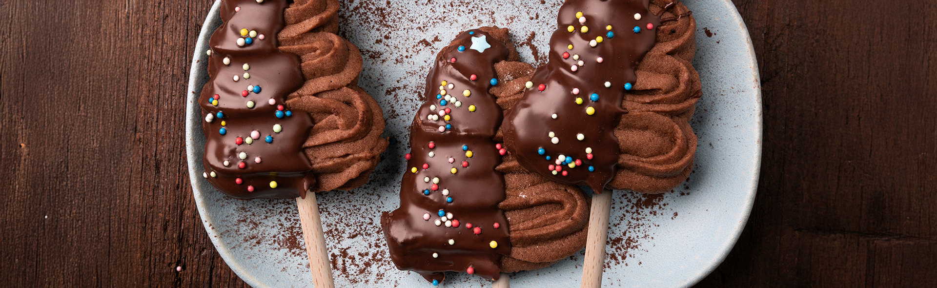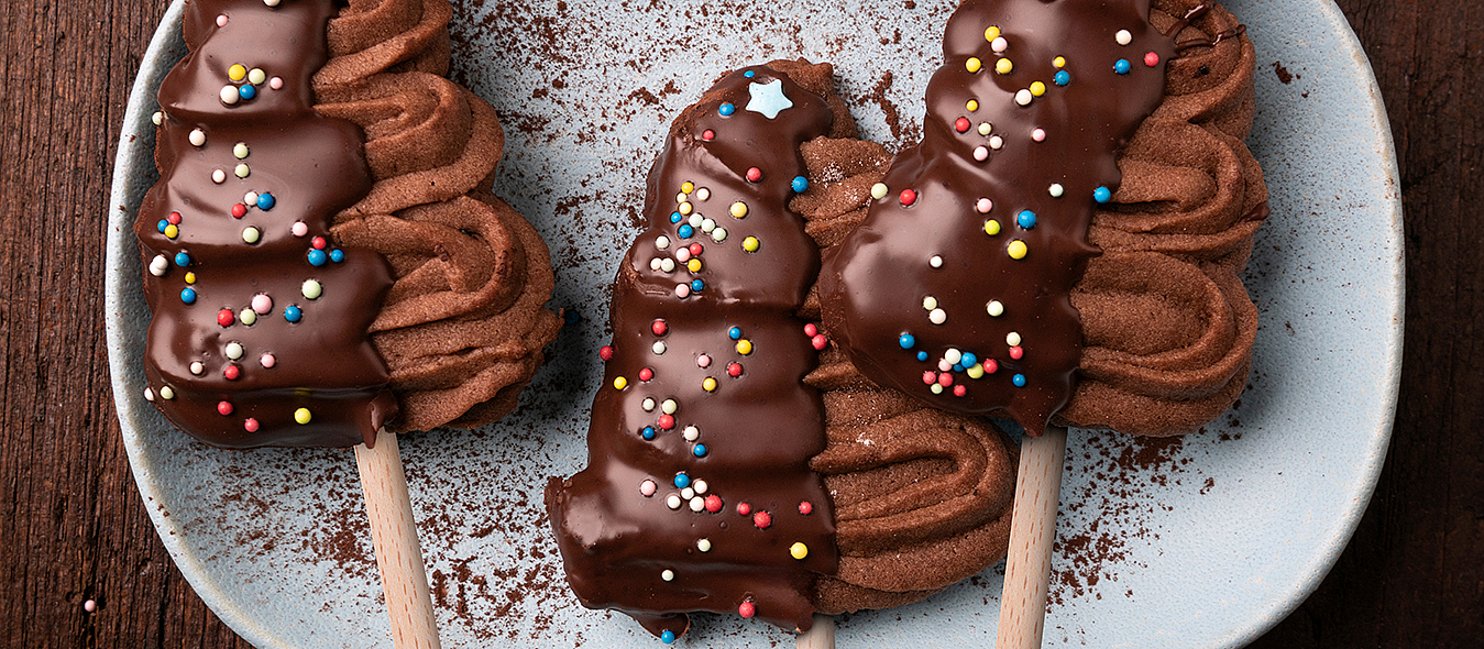 Vegane Plätzchen in Tannenbaumform am Stiel, überzogen mit Zartbitterglasur und bunten Zuckerperlen