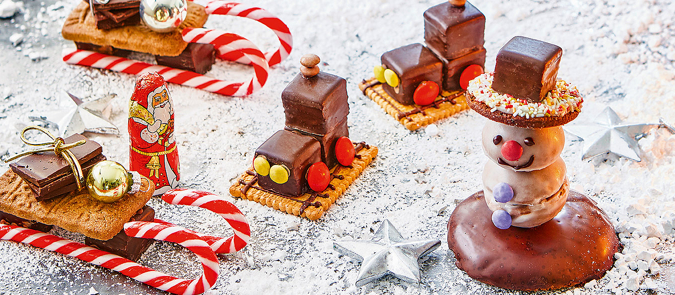 1. Für die Schlitten die Kuvertüre grob hacken und schmelzen. Zwei Stücke Backpapier (ca. 15 x 20 cm) zuschneiden und auf eine Arbeitsfläche legen. Zwei Dominosteine hintereinander aufs Backpapier setzen und die Außenseiten etwa zur Hälfte mit Kuvertüre bestreichen. An jeder Seite jeweils eine Zuckerstange als Kufen an die Dominosteine drücken. Kurz festhalten, bis die Kuvertüre antrocknet und klebt. Spekulatius auf der Unterseite mit etwas Kuvertüre bestreichen und auf die Dominosteine kleben. Mit den restlichen Zutaten einen zweiten Schlitten basteln. Die Schlitten mindestens 30 Minuten fest werden lassen, dann das Papier vorsichtig abziehen. Schlitten nach Belieben mit Schokopäckchen und Minichristbaumkugeln beladen.