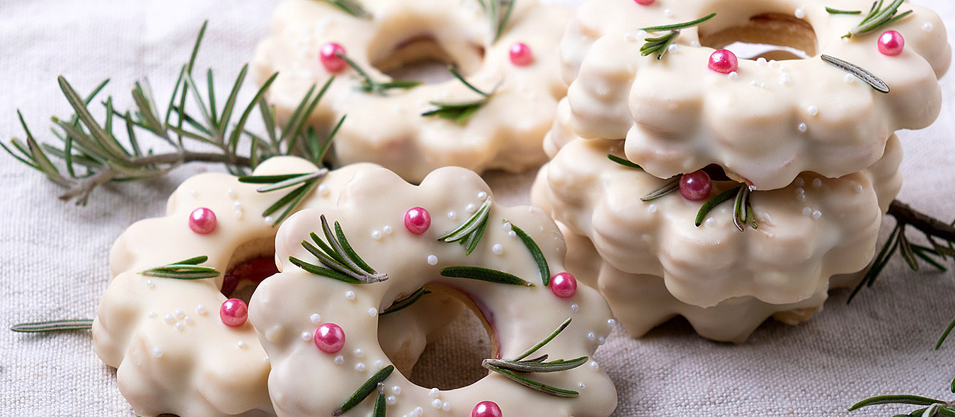 7. Schokolade hacken, schmelzen und die Plätzchen damit überziehen. Mit rosa Zuckerperlen und Rosmarinspitzen garnieren und aushärten lassen.